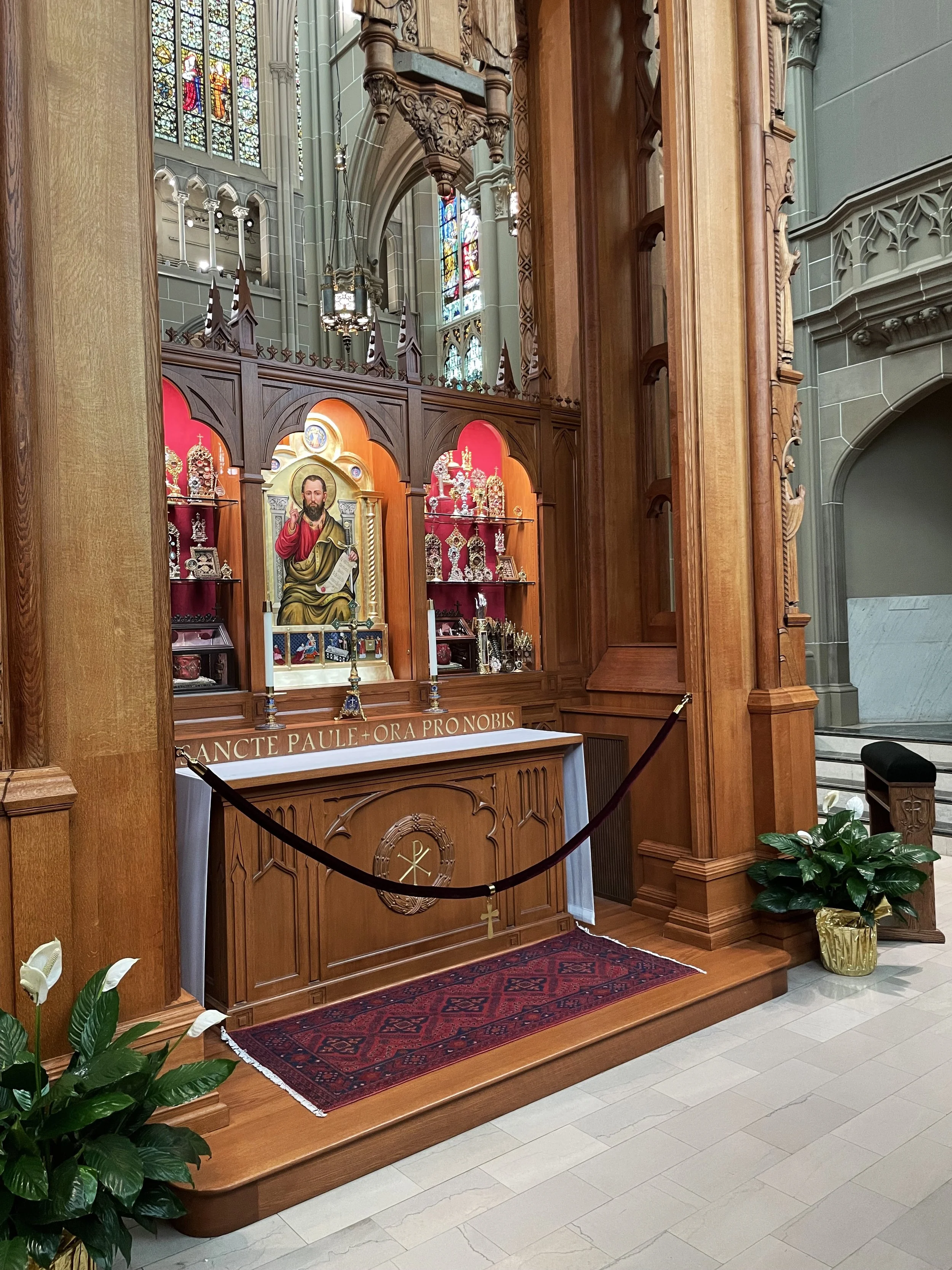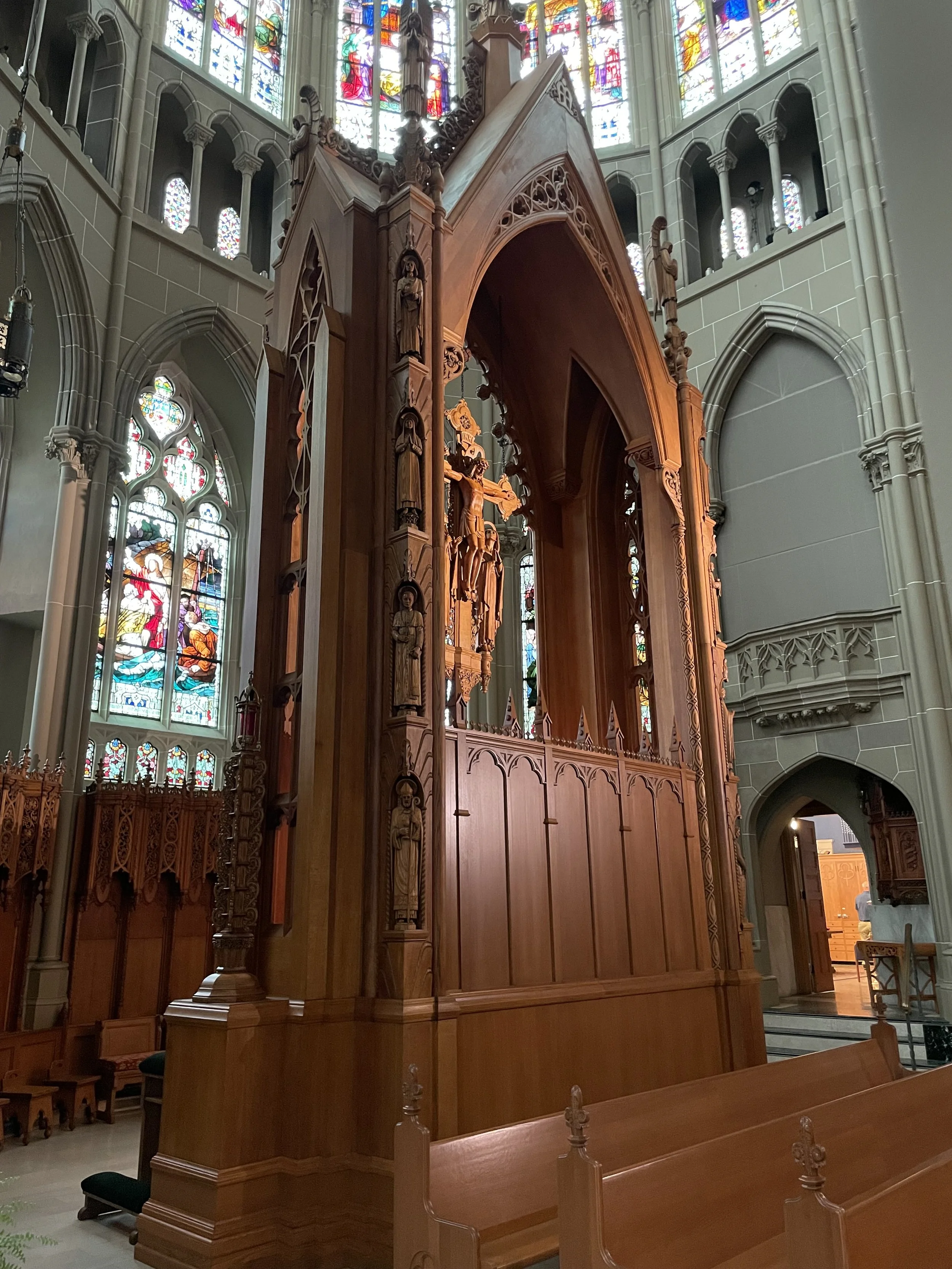 In 2001 during a cathedral basilica renovation, the altar was moved forward in the sanctuary, leaving the space beneath the wooden baldachin (canopy) empty. In 2020 with the support of +Roger Joseph Foys, tenth Bishop of Covington, Hainsey began designs for an altar concept beneath the baldachin that would accommodate and display the diocese’s collection of 350 relics.