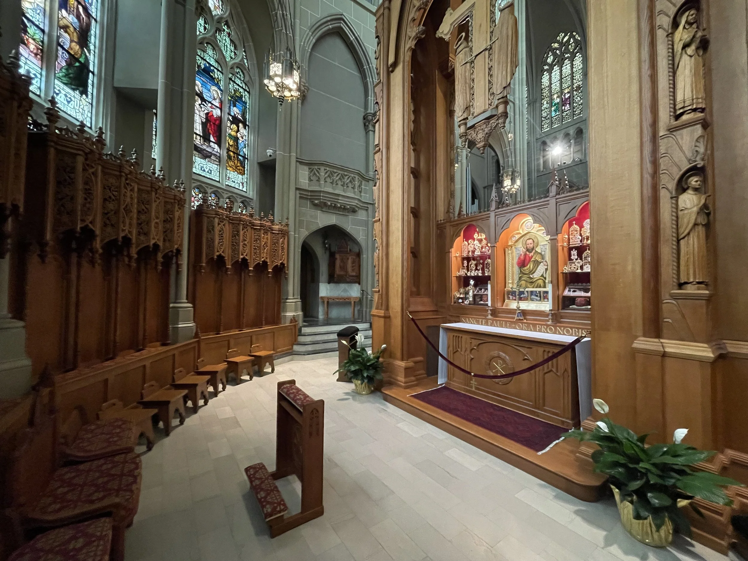 Working closely with Ratigan-Schottler Manufacturing, Hainsey designed a double sided altar: one paneled side facing the nave and the opposite side, with the altar and cases, facing the apse. Molding profiles were meticuliously taken to match the 1954 woodwork. Designs also ingeniously accommodated HVAC air returns in the baldachin’s base, new lighting, and the seamless integration of the new woodwork with the cathedral basilica extant woodwork.